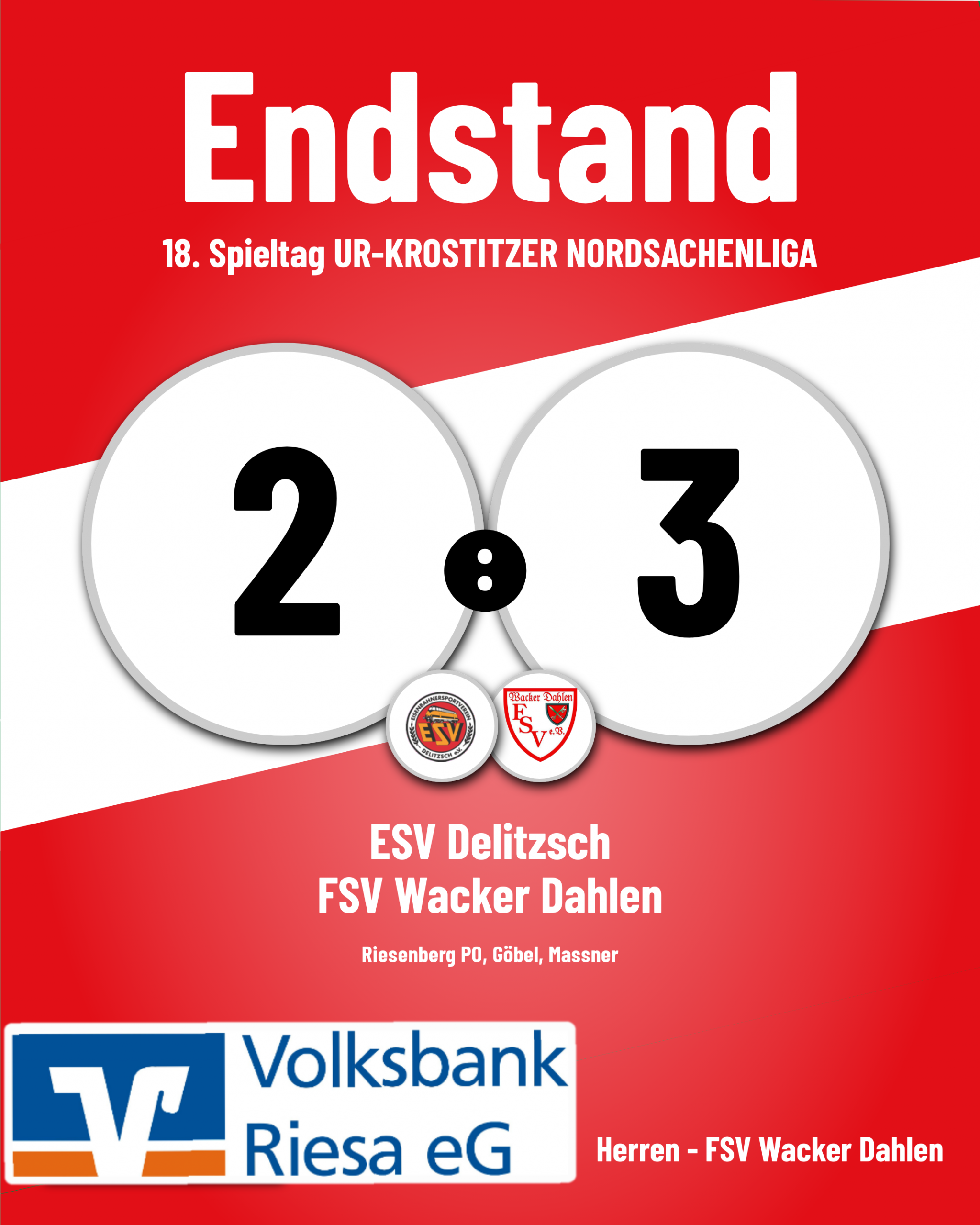 Der FSV Wacker Dahlen und der LSG Löbnitz boten den Zuschauern zahlreiche Tore und trennten sich zum Schluss mit 2:3. Der LSG Löbnitz wurde der Favoritenrolle somit gerecht. Die Gäste waren beim 2:0 als Sieger des Hinspiels hervorgegangen.